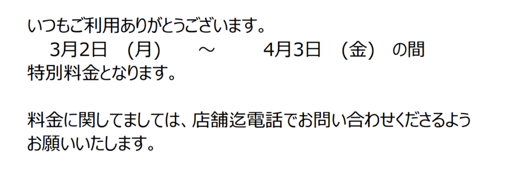 春休み料金の期間は、一般的に3月初旬〜4月上旬が目安です。