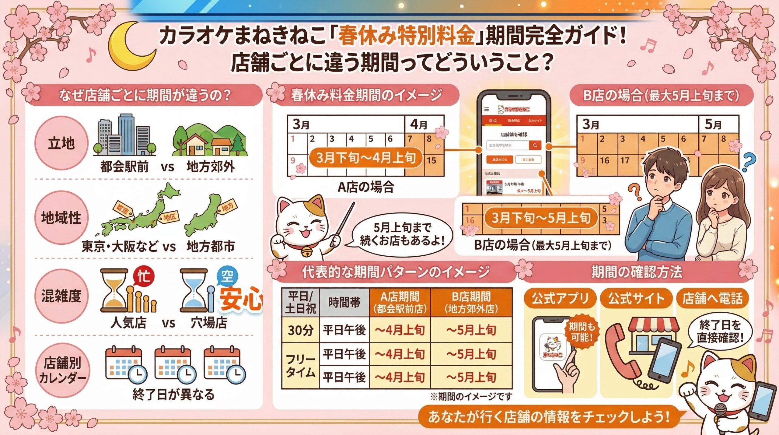 結論から言うと、まねきねこの春休み料金は全国共通ではなく店舗ごとにバラバラです。