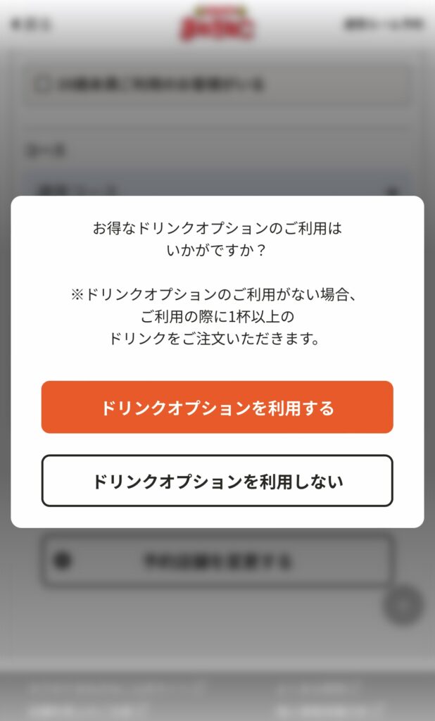 ドリンクバーor飲み放題のオプションを選択できます。ワンドリンク制のため、選択がないと利用時に1杯以上の注文が必要になります。
